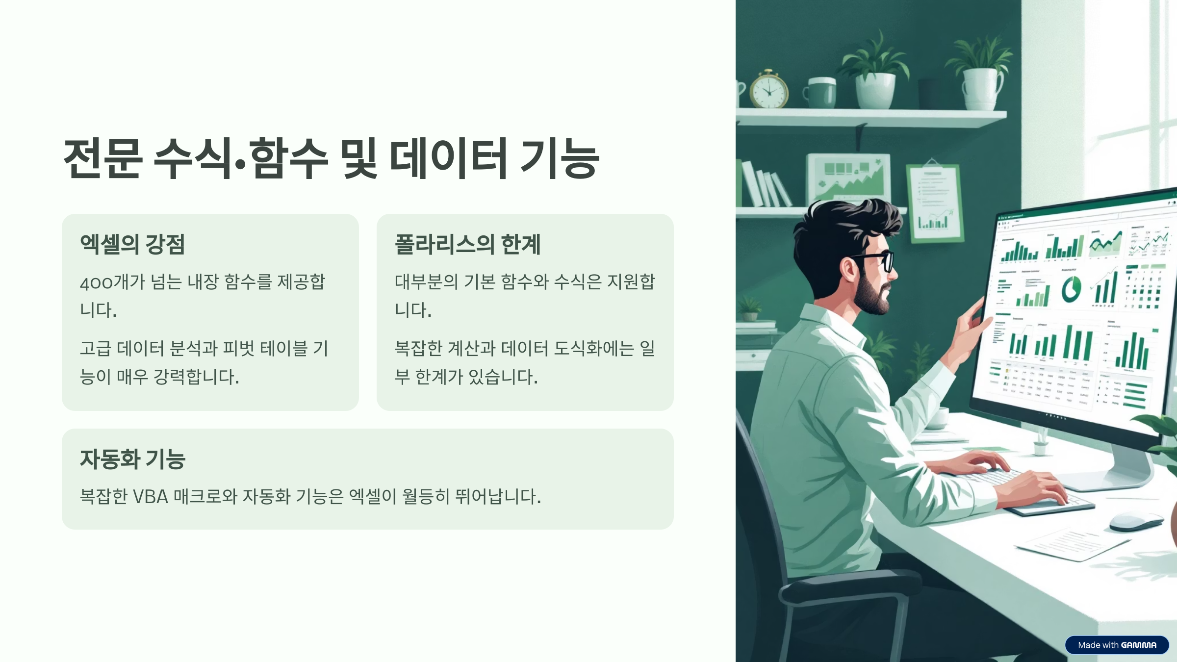 강력한 기능: 고급 수식, 매크로, 데이터 분석 도구, 자동화 기능 등이 포함되어 있어 전문적인 작업이 가능합니다.